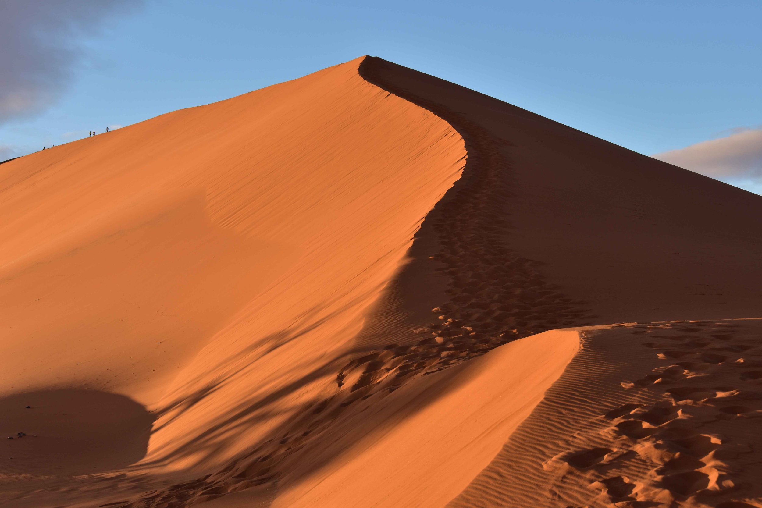 We got up very early to get to Sossusvlei and climb the famous Dune 45. The red sand is made up of dust that has blown here from the Kalahari desert and is about five million years old. Climbing a sand dune looks easy, and I imagined I could just run up, but every footstep sinks into the sand and it took a lot of energy to get to the top. I was glad we had got here early as it looked stunning in the sunrise with one side shaded.